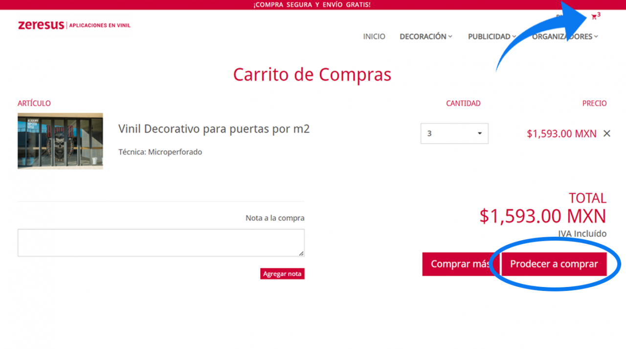 4. Puedes revisar tu carrito en la esquina superior derecha de tu pantalla para ver los artículos que has añadido, para hacer tu compra ve al carrito y dale click a "proceder a comprar"