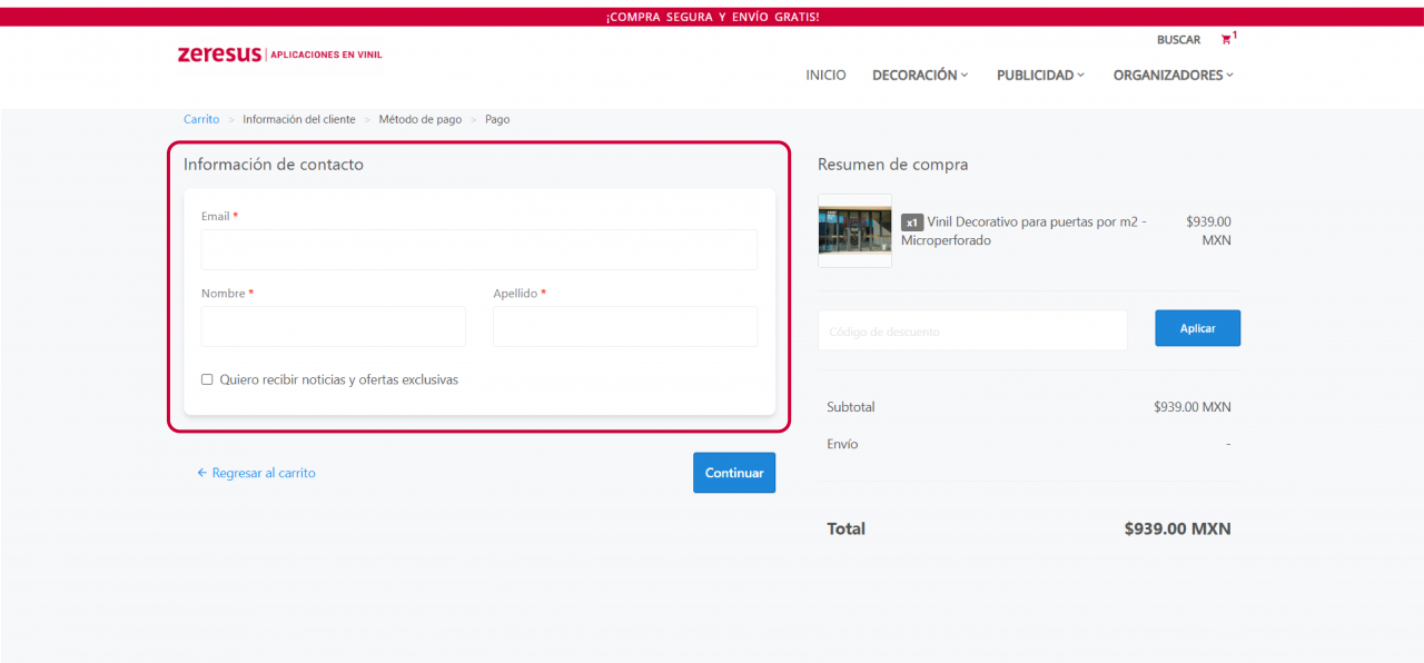 5. Una vez que vayas a realizar tu compra te vamos a pedir los datos pertinentes para poder llevar a cabo el registro (cuando así lo desees), el cobro y la entrega de tu producto.